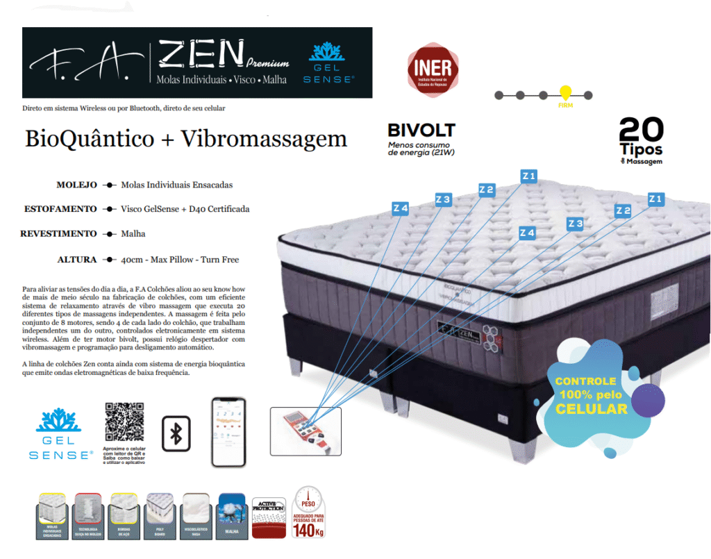 O Colchão Zen Premium BioQuântico FA Colchões foi desenvolvido para transformar suas noites em uma verdadeira experiência de bem-estar. Equipado com a exclusiva tecnologia de vibromassagem, ele executa 20 movimentos independentes de massagem diretamente na superfície, ajudando a aliviar tensões, reduzir o estresse e melhorar a circulação sanguínea.